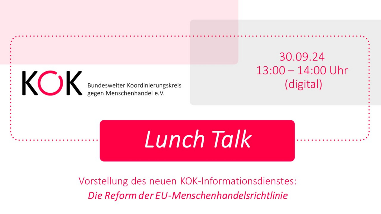 Im Juli 2024 ist die Reform der EU-Richtlinie zur Bekämpfung des Menschenhandels in Kraft getreten. Der diesjährige KOK Informationsdienst„Die Reform der EU-Menschenhandelsrichtlinie: Von guten Ansätzen und verpassten Chancen“ stellt die wichtigsten Änderungen und Anpassungsbedarfe aus Sicht des KOK e.V. vor. Es zeigt sich, dass die Reform viele wichtige Ansätze beinhaltet. Insgesamt hat die EU jedoch die Chance verpasst, ein menschenrechtsbasiertes Konzept vorzulegen, das die Position und Rechte Betroffener wirklich stärkt und Entwicklungen hinreichend berücksichtigt.