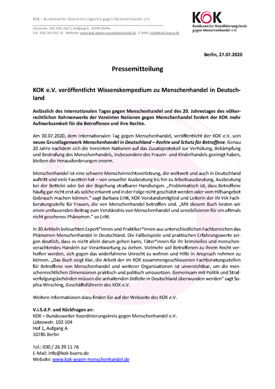Berlin, zum 30.07.2020, dem Internationalen Tag gegen Menschenhandel, veröffentlicht der KOK e.V. sein neues Grundlagenwerk Menschenhandel in Deutschland – Rechte und Schutz für Betroffene. Genau 20 Jahre nachdem sich die Vereinten Nationen auf das Zusatzprotokoll zur Verhütung, Bekämpfung und Bestrafung des Menschenhandels, insbesondere des Frauen- und Kinderhandels geeinigt haben, bleiben die Herausforderungen enorm.