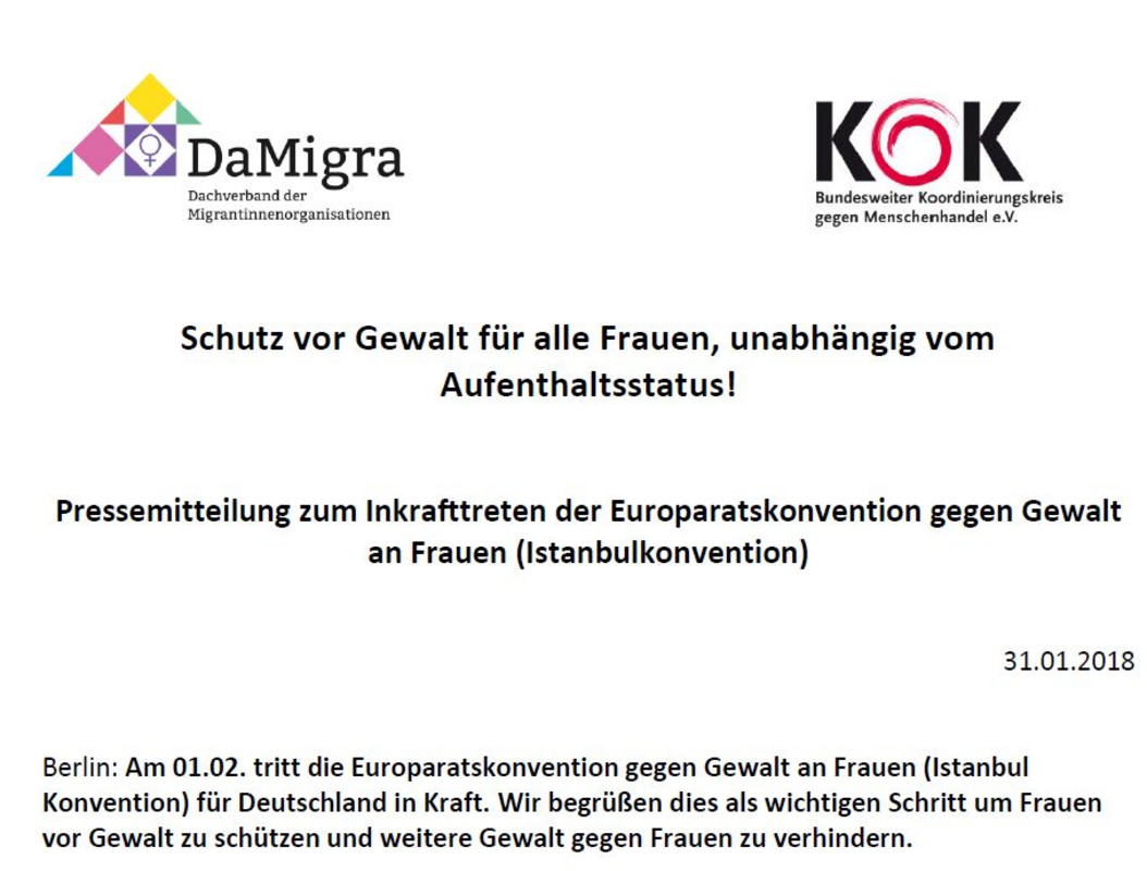 In einer gemeinsamen Pressemitteilung begrüßen der KOK und DaMigra dies als wichtigen Schritt um Frauen vor Gewalt zu schützen und weitere Gewalt gegen Frauen zu verhindern.
