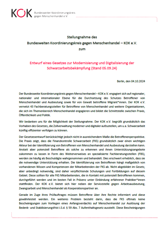 Der KOK kritisiert daher, dass der vorliegende Gesetzesentwurf Menschenhandel, Ausbeutung und die Perspektiven der Betroffenen nicht ausreichend berücksichtigt.
